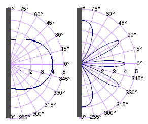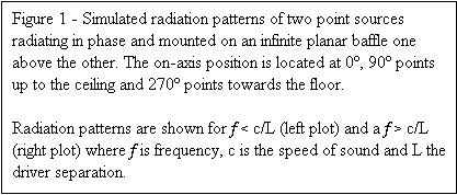 Radiation patterns are shown for f < c/L (left plot) and a f > c/L (right plot) where f is frequency, c is the speed of sound and L the driver separation.
