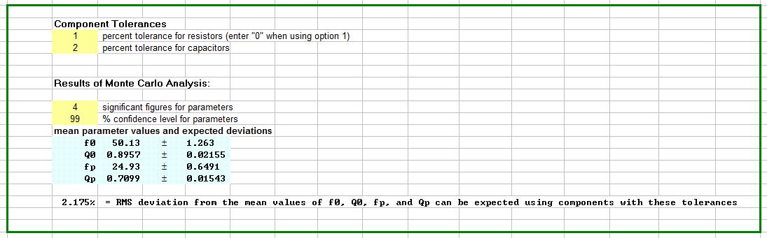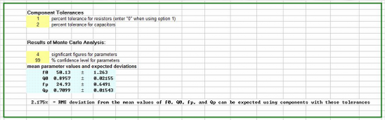 Mismatches between the "ideal" values and those that can be obtained in a discrete series (e.g. E96 resistors) are one source of error. The other source of error is the actual value of the component due to finite tolerance around the series value. Using a Monte Carlo approach, the variation in error that can be expected from component tolerances is presented. For most cases, the errors resulting from component tolerances are significantly higher than the errors resulting from the choice of the scaling factor and the discrete nature of real world component values. The spreadsheet helps the user make tradeoffs between complexity and cost of the circuit design, to identify which components to purchase, and to establish bounds for the performance of the as-built circuit. The statistics help the user to improve both the accuracy, and the precision, of the resulting analog circuit.