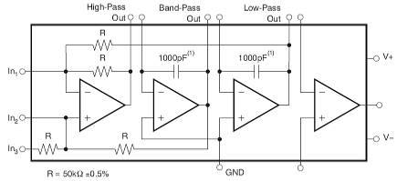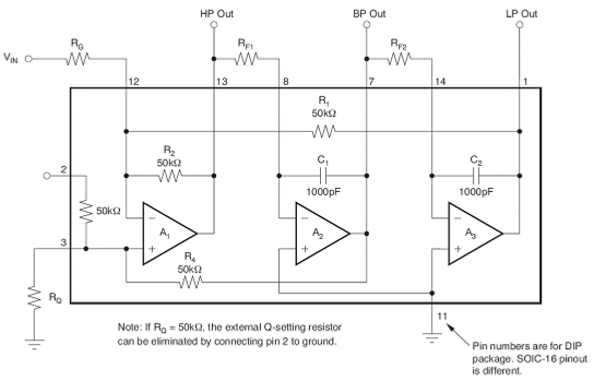 The UAF42 IC is designed to make it possible to easily create (using the 3 op amps on the left) a second order high-pass filter with independently variable Q, resonant frequency (Fo) and Gain.