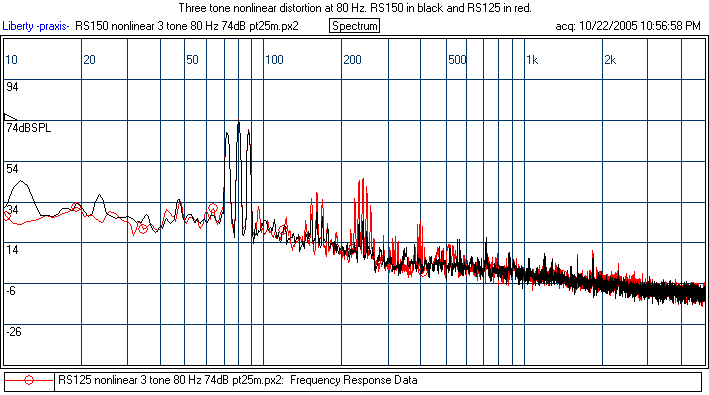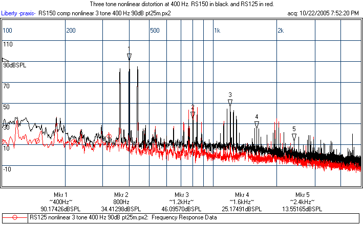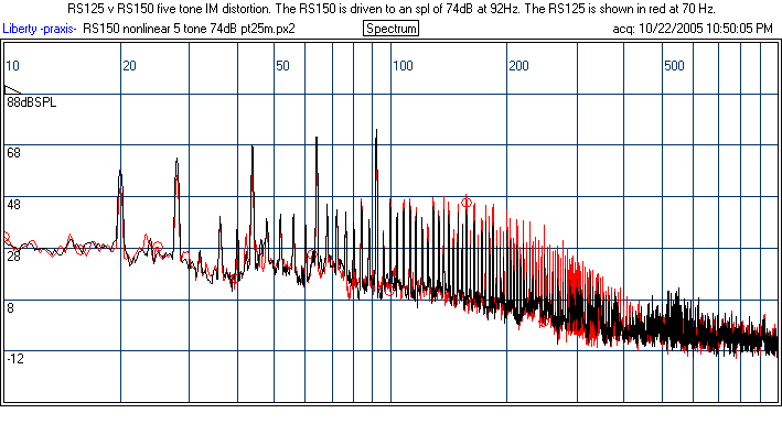 Note that for the five tone, I meant to say, "The RS125 is shown in red at 70dB, not 70 Hz. So the RS125 is driven at 4 dB less. Nonetheless, it has a bit more distortion anyway.