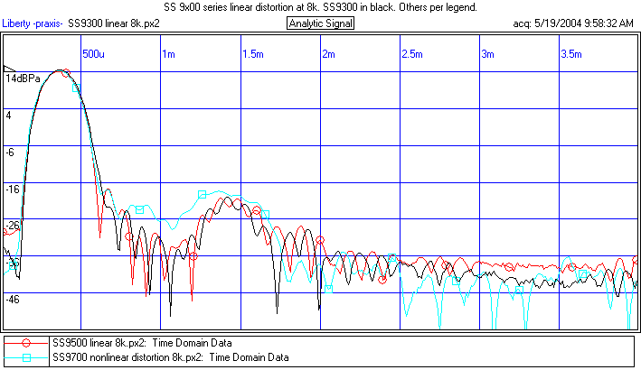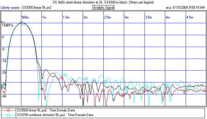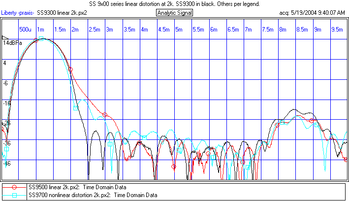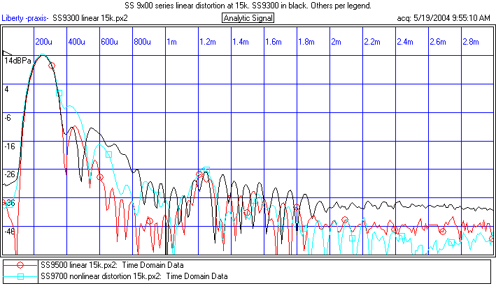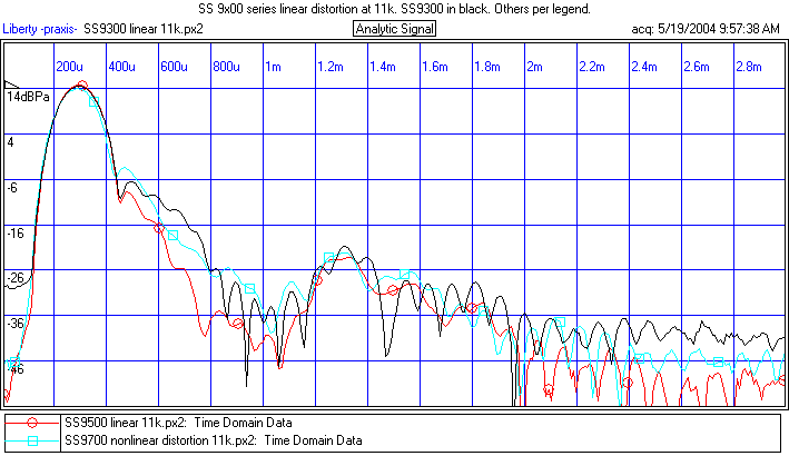 Overall, a very nice line. Certain items stand out and surprising and others expected. In general, from 2k on up, the higher you go in price, the better the performance. There is a significant difference between the 9300 and the 9500/9700 with the 9300 being slightly worse when considering nonlinear distortion. The 9700 is incrementally better than the 9500, but the overall spectrum of the 9500 is slightly cleaner, even if the numbers are slightly higher for the 9500. So the rank order, as expected, from top to bottom is 9700-9500-9300. What's not so expected is that the 9700 does notably worse at 1.5k than the other two. The 9700 is best used at 2k and above. In fact, tests as well at 2k and above then any other tweeter to date.