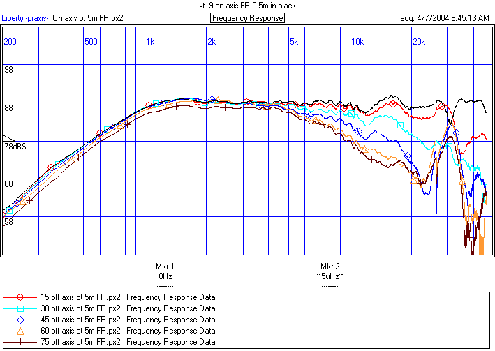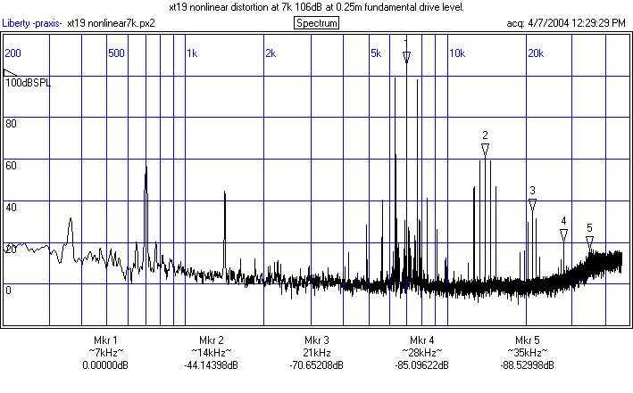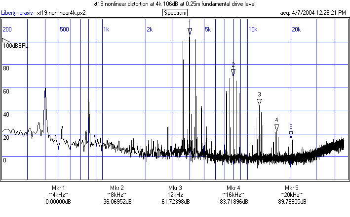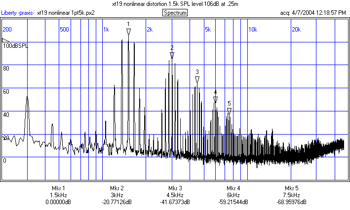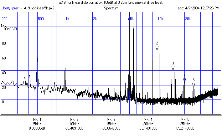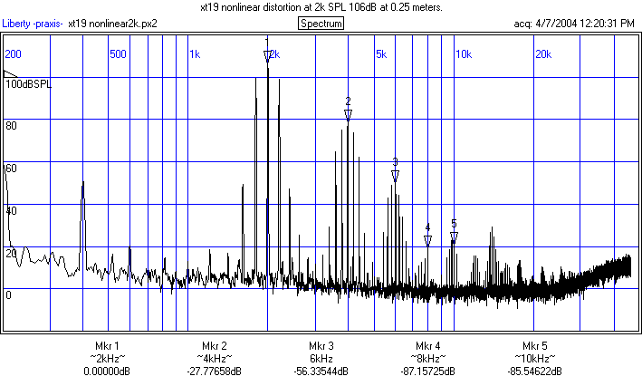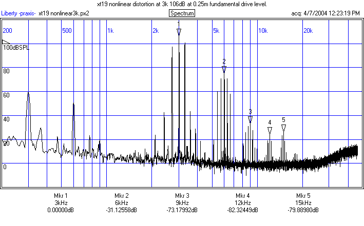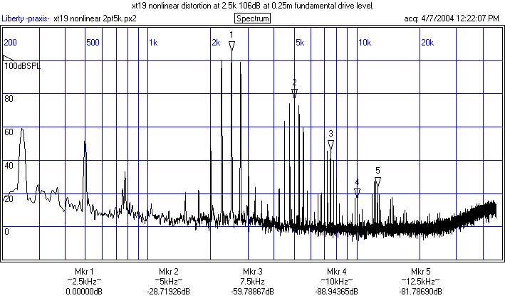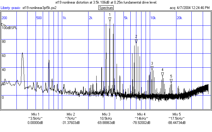 2. The xt19 had very good distortion numbers-in some cases better, in some cases, slightly worse than it's larger sibling. Overall though, in the same ballpark as it's larger brother. This is both peculiar and good news. Peculiar in that diaphragm excursion should be higher for any given spl than the xt25. It's good news because the xt19 distinguishes itself from its brother in a very important way, namely significantly better off axis performance. While I wasn't really suprised that its off axis performance is better, it is notably better. It's as good as most 1" domes, if not a bit better.