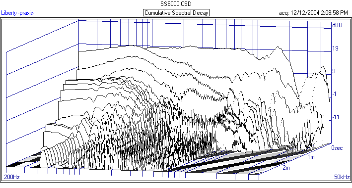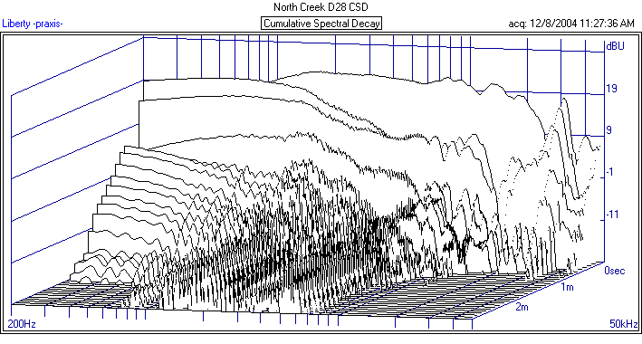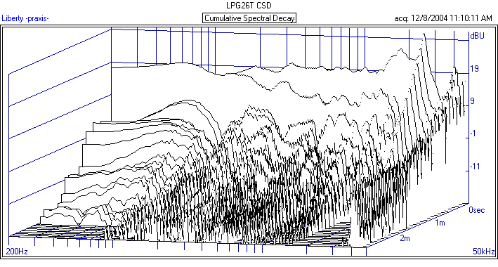 A note on the above. Because the drivers were not perfectly flush mounted, this causes reflections which show in the CSD, predominantly as the low level "grunge" between 1k and 10k. So this is artifactual. However, the LPG issue is a bit different. There is a metal grill and a plastic diffuser on the tweeter, which creates all sorts of reflections that are "splattered" throughout the CSD plot. So, let's look at the time domain tonebursts.