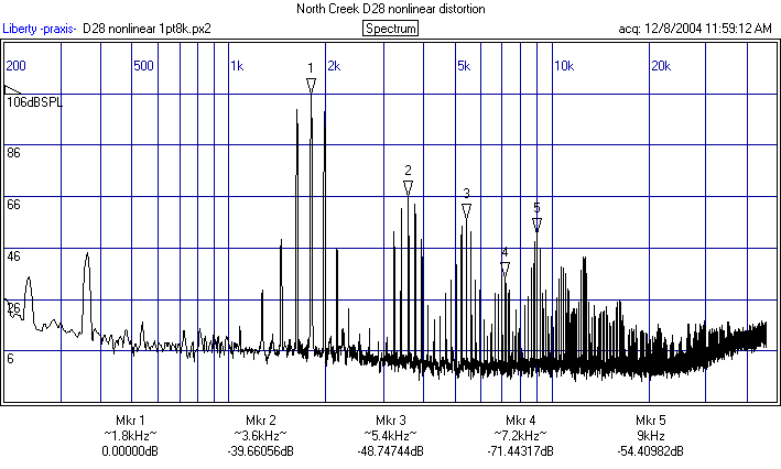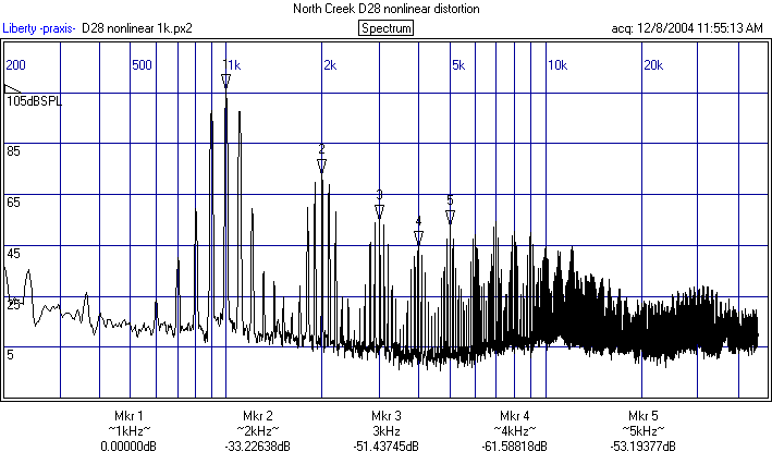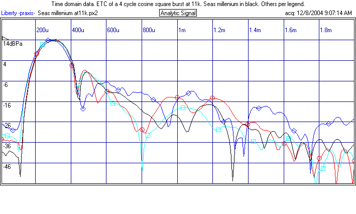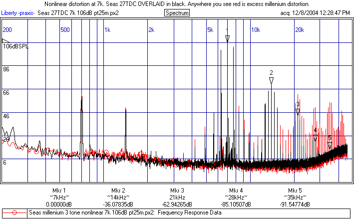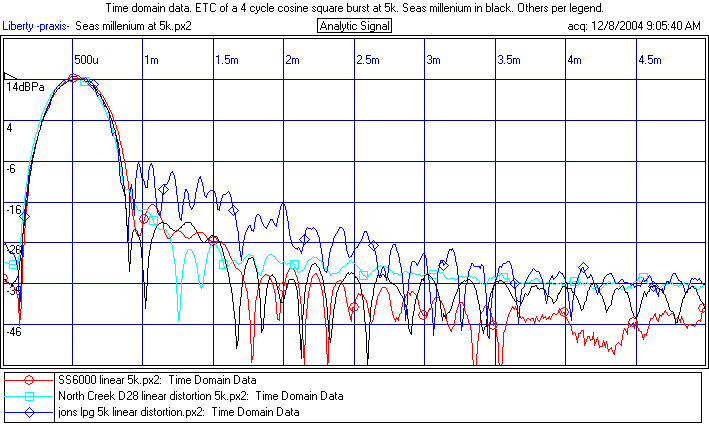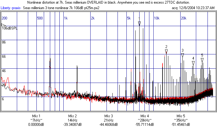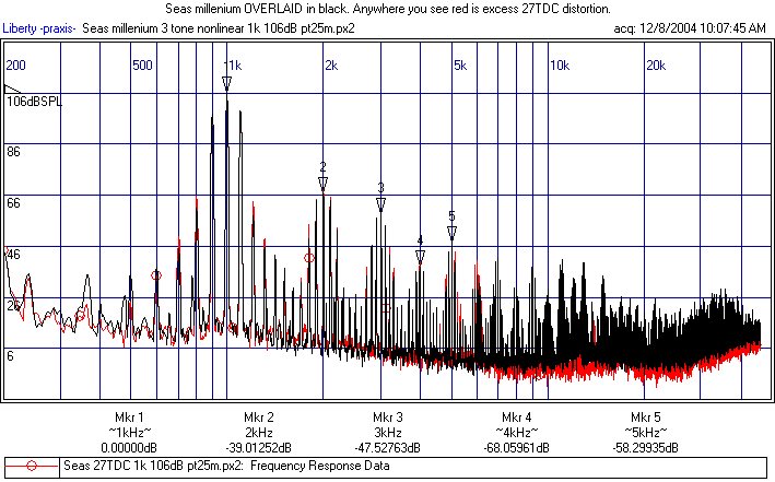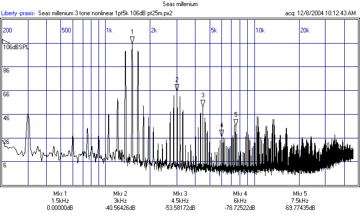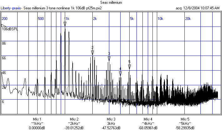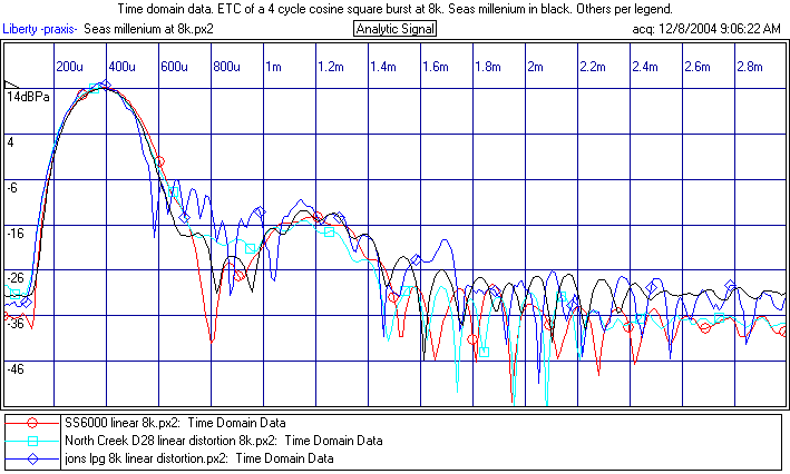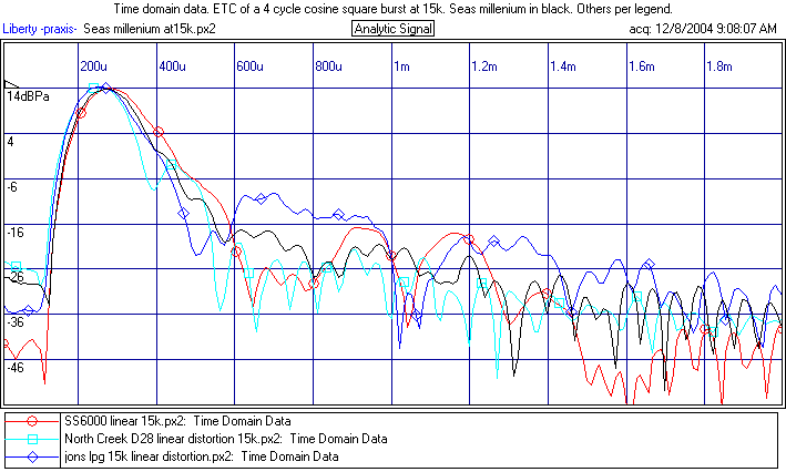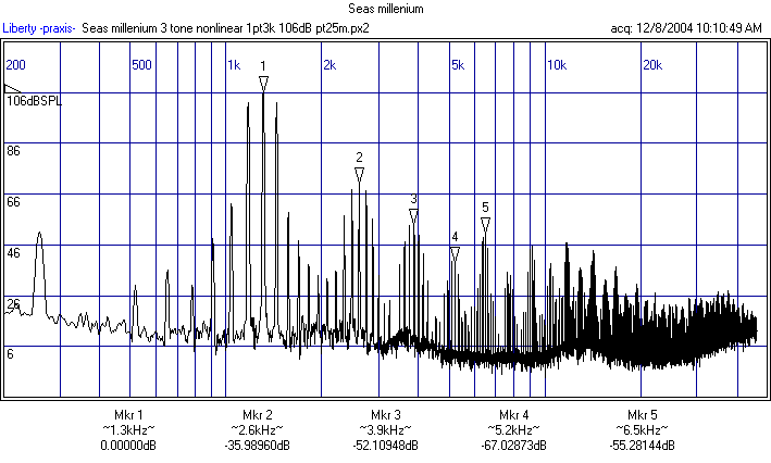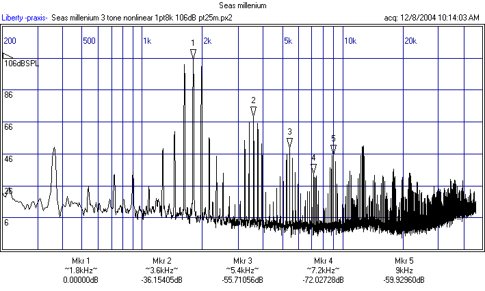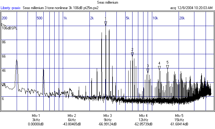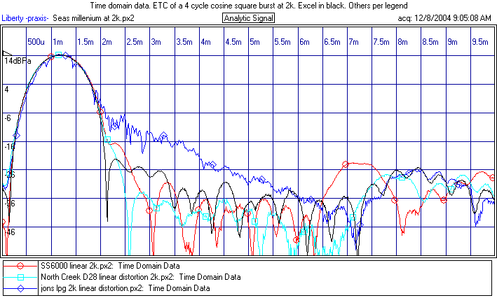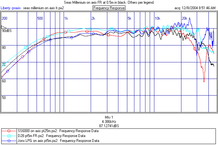 Of these four, the millenium is able to cross the lowest with respect to 2nd and 3rd order distortion products. But higher order products from the excel are somewhat disappointing. If you don't need to cross low, say, in a three way, the D28 and SS6000 are better. And, except for some higher second order products from the SS6000, it to can be crossed low and does better up higher. The linear distortion numbers are similar for all except the LPG, which did slightly worse, likely because of the grill and diffuser. Unfortunately, the LPG also failed to distinguish itself on nonlinear testing, with lots of nonlinearity.