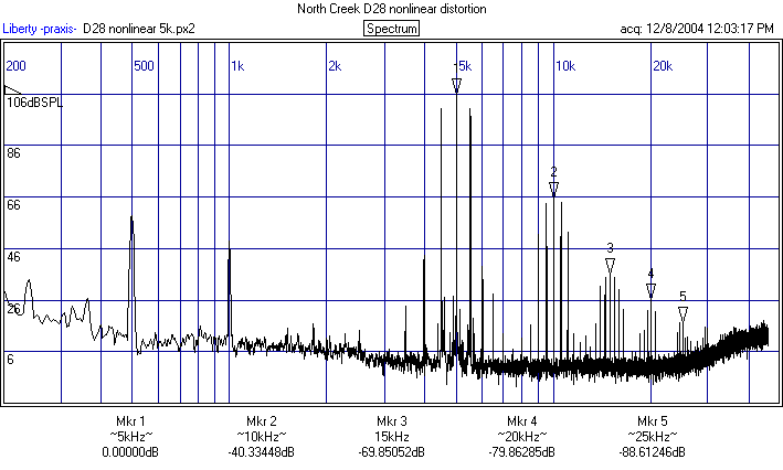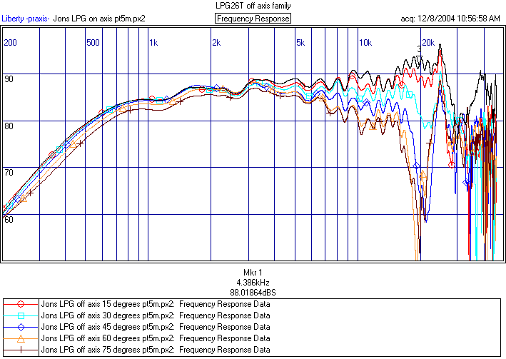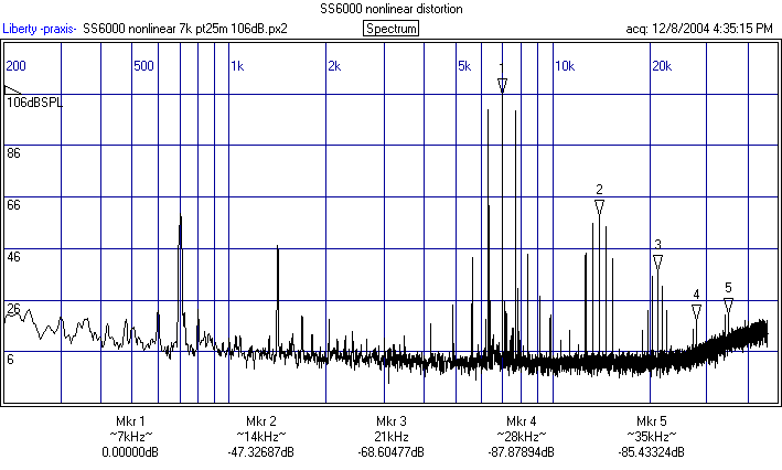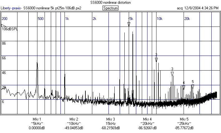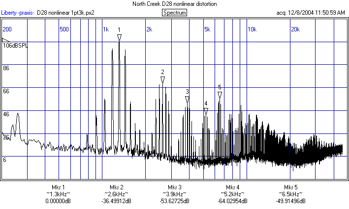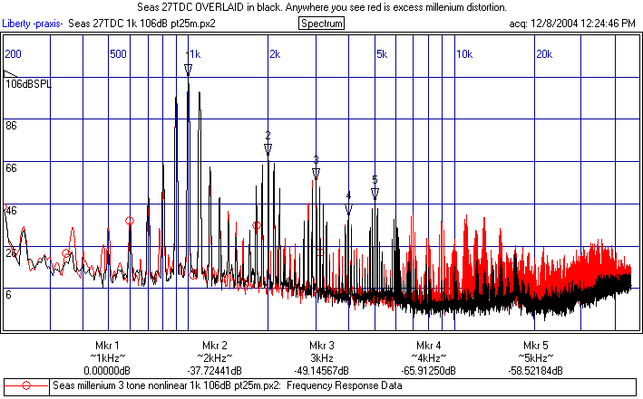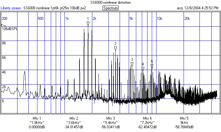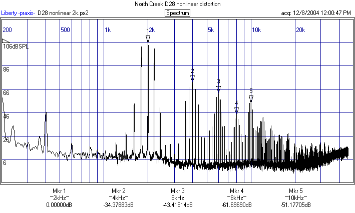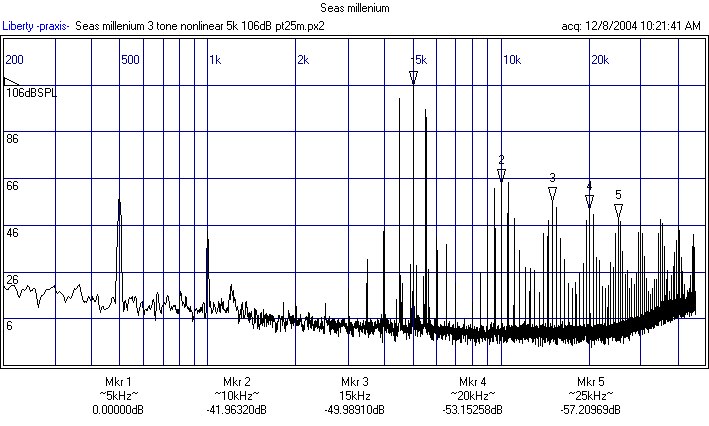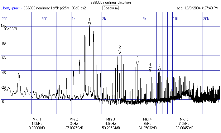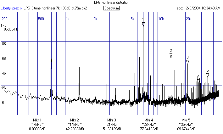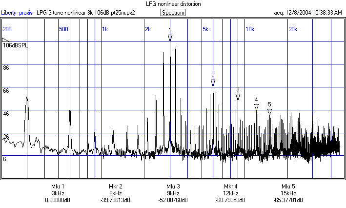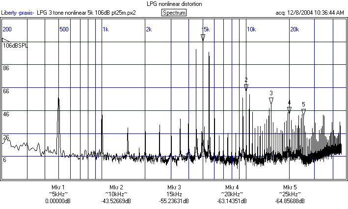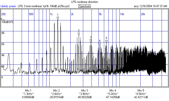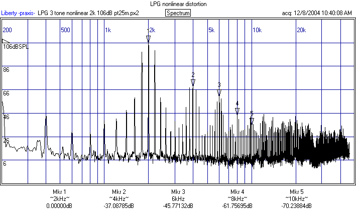 As an aside, let me comment on some aspects of the LPG's performance in light of the following observation. It's always puzzled me why so many builders noted problems with their speaker's sound, just by moving the xover point 200-400 hz down or up. If you look at the difference in the second and third order families of distortion products at say, 1.5k and 2k, you don't notice that much of a difference. So are all those builders wrong? Well, probably not. Here's my observation, for what it's worth. Consider the LPG nonlinear distortion plot above, at 2k. Well, at 2k, the offensive higher order products are -60dB and, maybe just as important, they are centered between, roughly, 15k-25k. So, not that audible, except maybe as that added detail, or perhaps, metal dome sound. Now, push the xover to 1.5k. Nothing significant has happened to the second and third order product levels, but now the higher order distortion products have increased in level to -50, they've increased in number, and the center of the rub/buzz distortion products is now at 15k and the spread is roughly between 7.5k and 22.5k. So the spectrum of the higher order products has drifted down significantly, and is likely much more audible.
