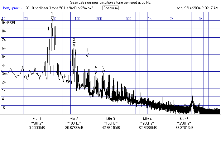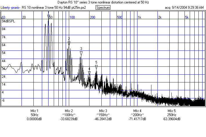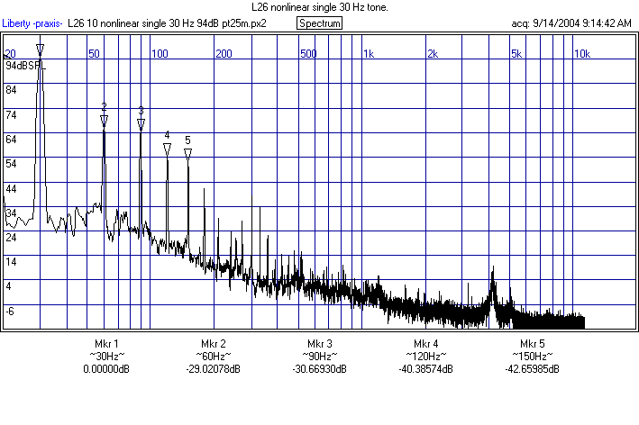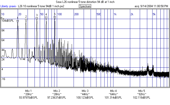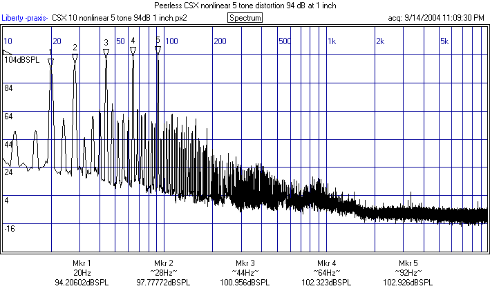 A multitone burst of 20, 28, 44, 64, 92 Hz. This is a challenging test and the level was set to 9dB with a distance of 1 inch so as to not destroy the drivers.