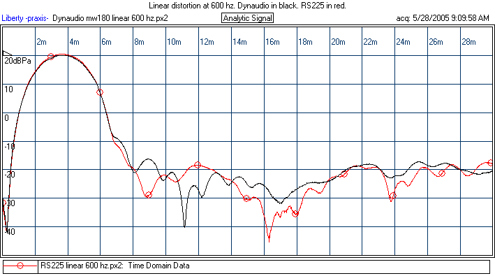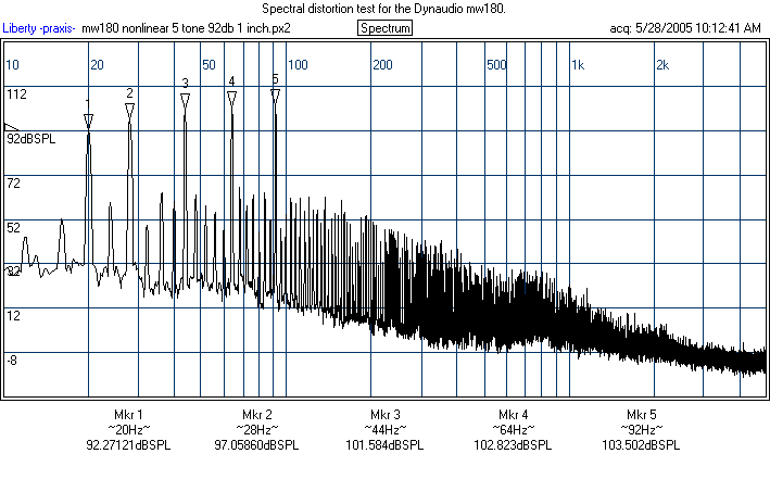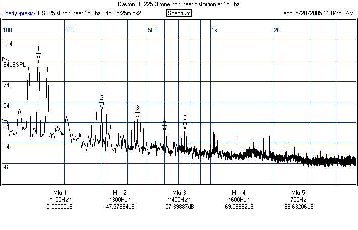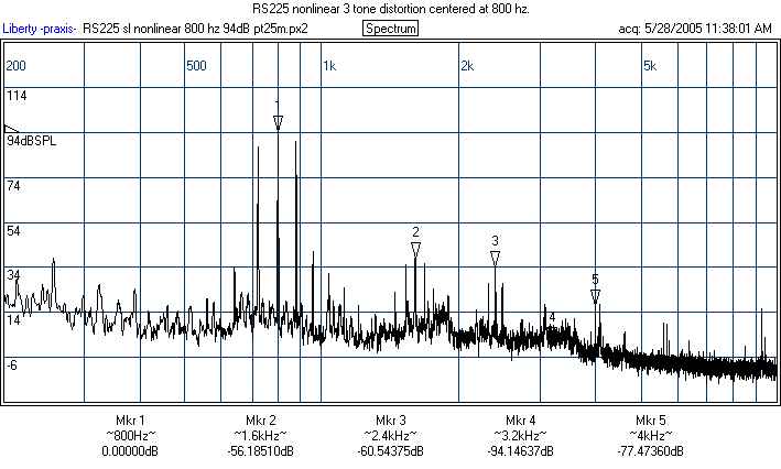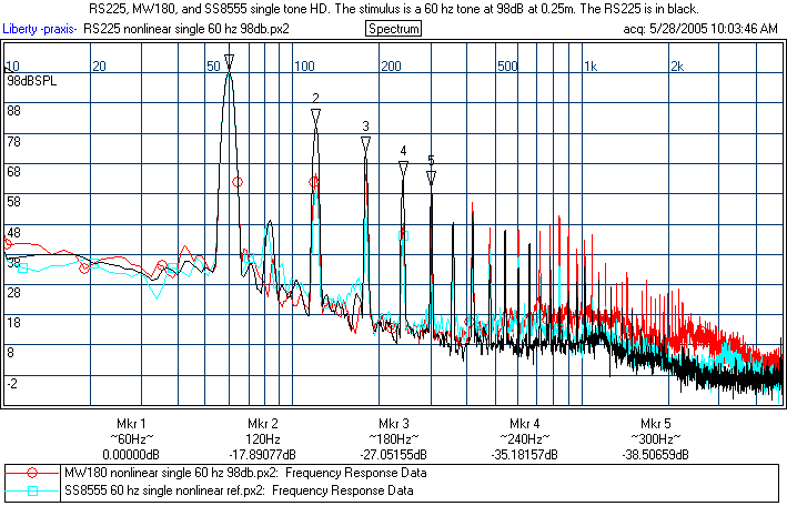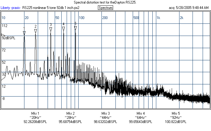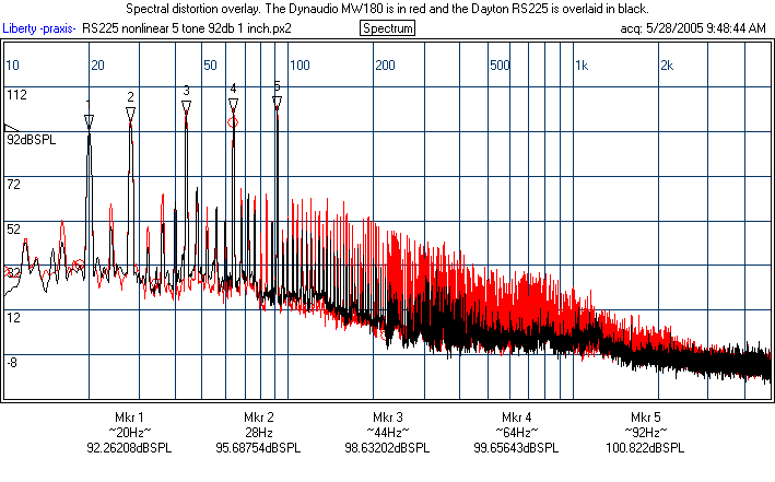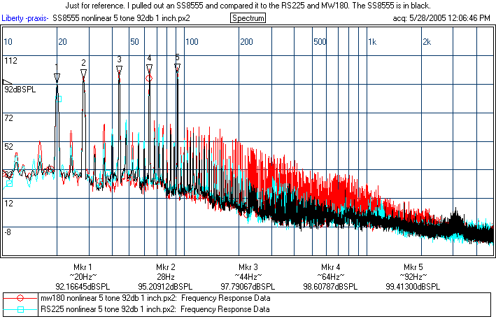 The behavior of the RS225's is a bit puzzling. It clearly does well, as the prototype did, on the spectral and nonlinear distortion above 100 Hz, but it did notably worse on the 60 Hz single tone test. I checked another one I had and this was similar. I will likely test the other two (I bought four RS225's) at some point and update. Also, I'll make Darren aware and recheck one sometime down the road. Overall, the RS225 is still a fine performer, but if this HD result is representative of excursion below 100 Hz, then this means the production RS225's xmax may be a bit smaller than the prototype's. I would still say the nonlinear distortion numbers of the RS225 are, on the whole, better than the Dynaudio's on the strength of the spectral and numbers above 100 Hz. The production Daytons I tested were no worse than the Excel, though they cannot match the brute excursion of the SS8555.